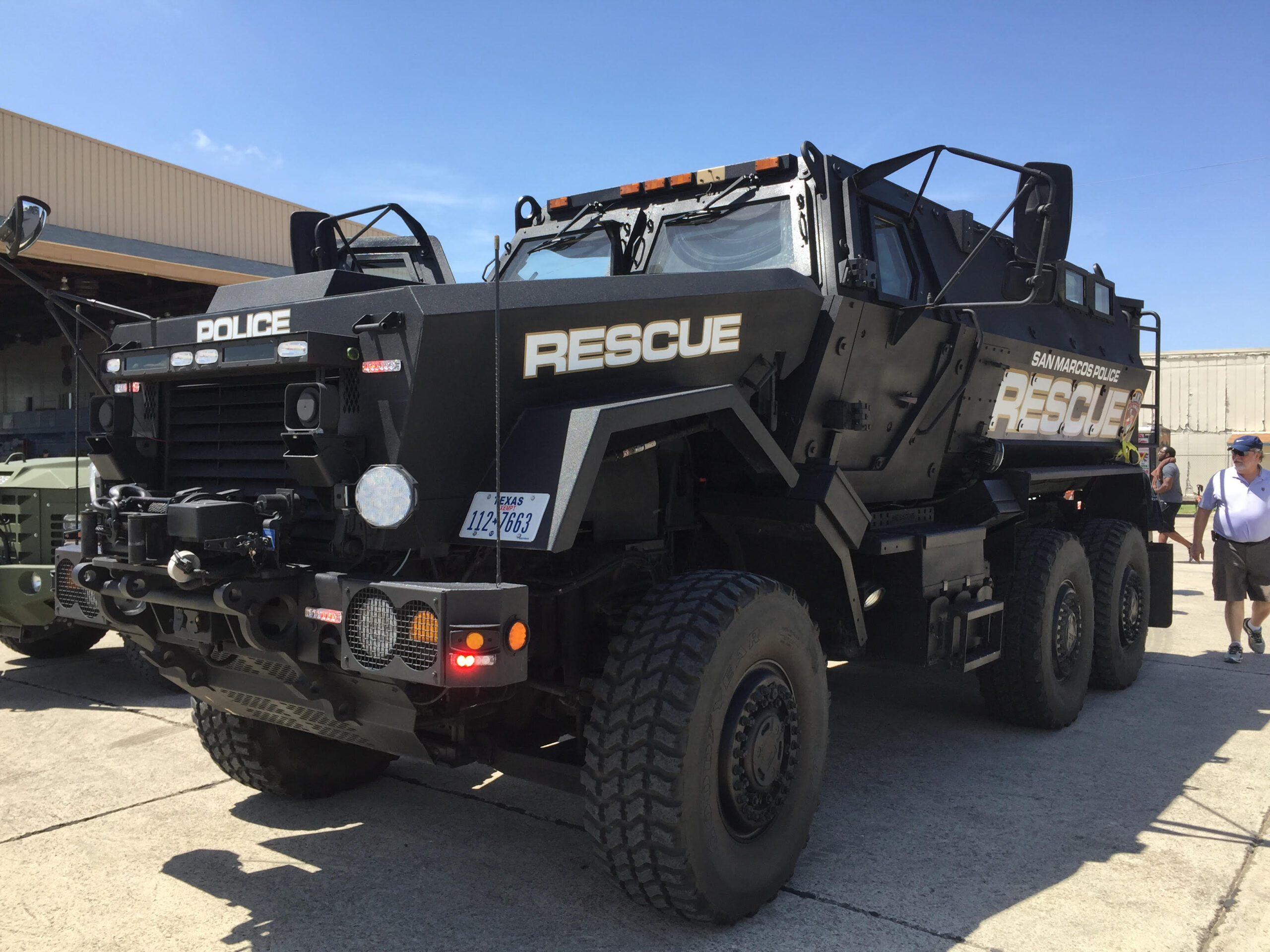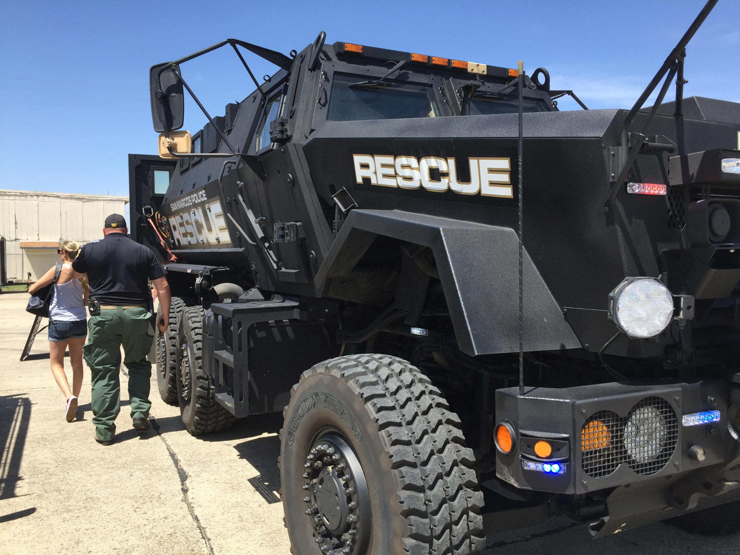 Another interesting vehicle I witness at the event was the San Marcos SWAT team’s new ride, which like a lot of police officers, was also ex-military. Named The Caiman, this behemoth tips the scales at 48,500lb of brute strength and can run after bad guys at up to 65 mph. I stands 10 feet tall, 8 feet wide, and 21 feet in length. The driver of the Caiman looked like actor Gregor Clegane who plays the Mountain on Game of Thrones. Did I mention this machine can deflect just about anything short of a missile?