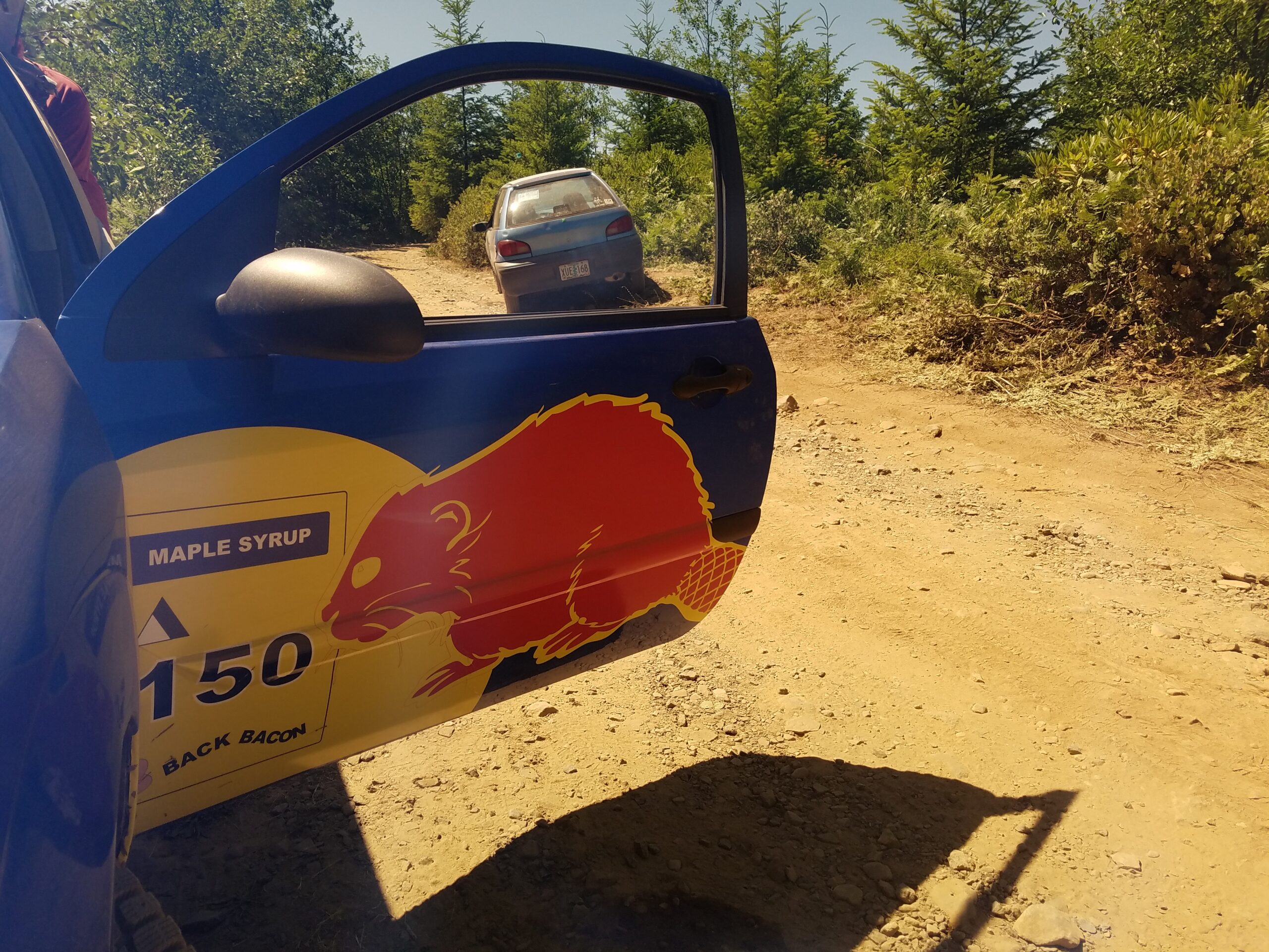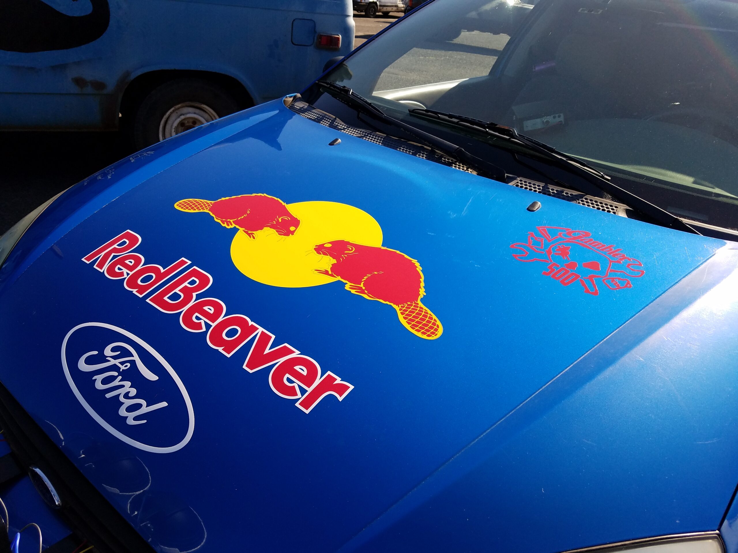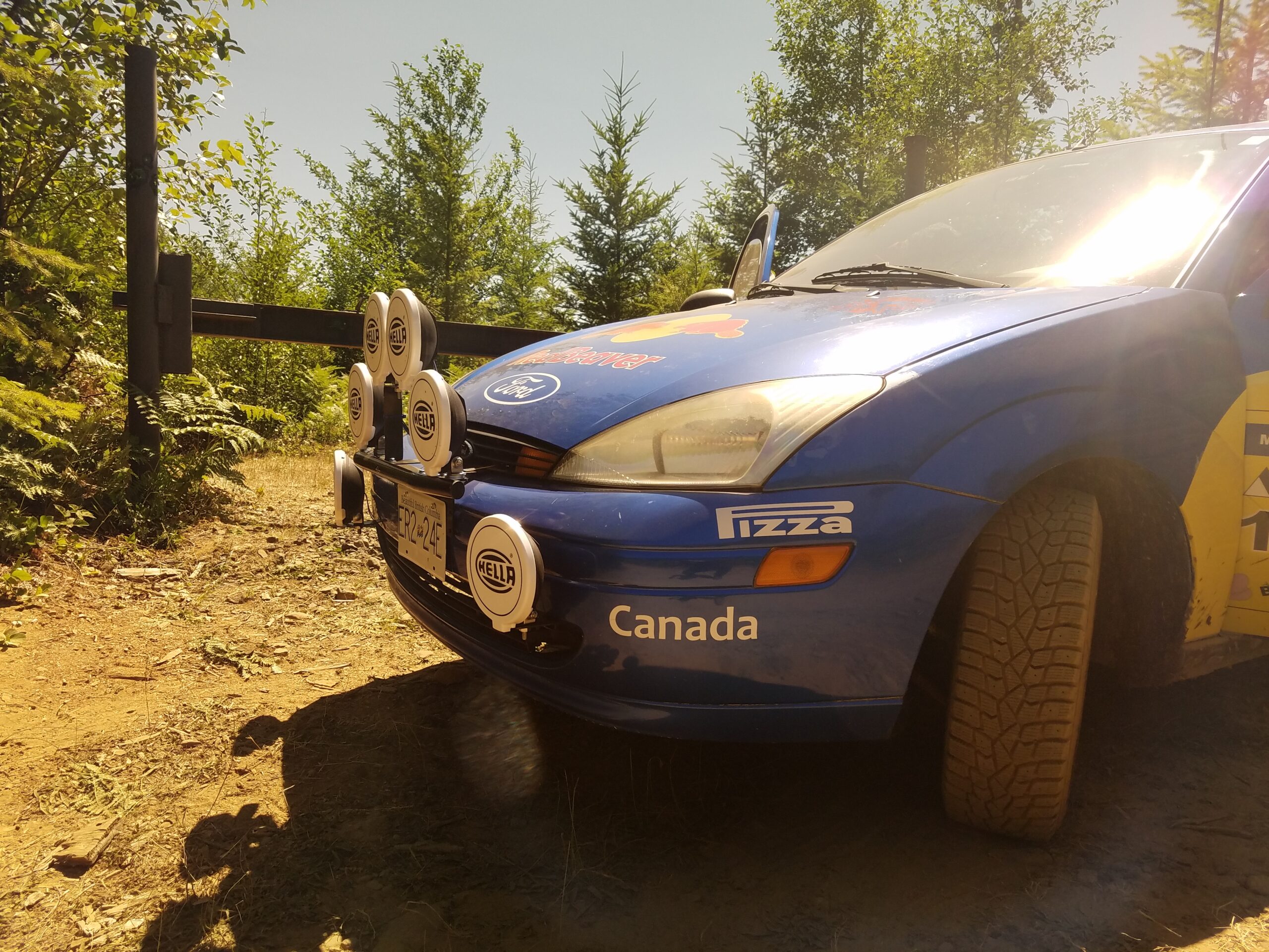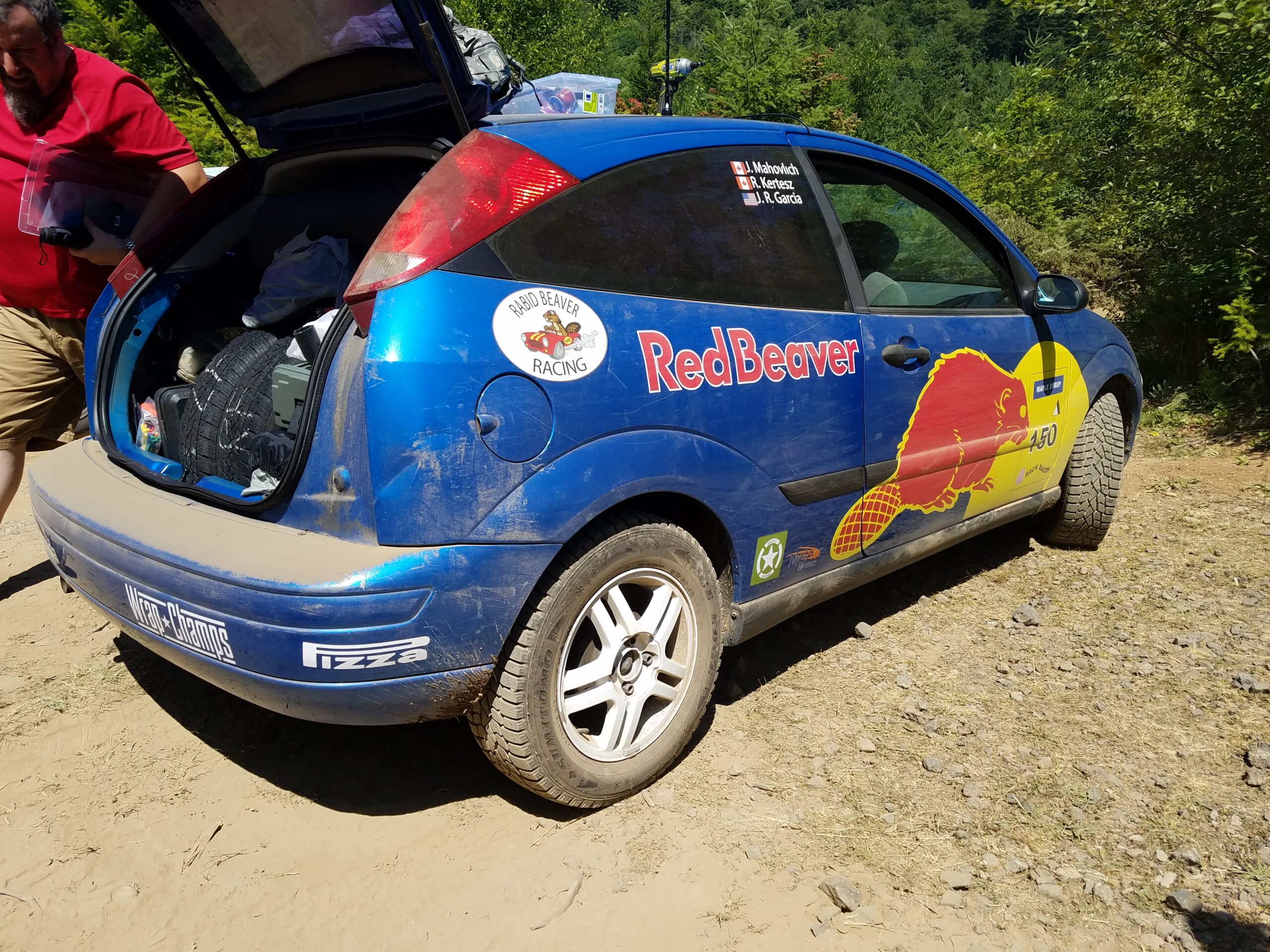 The Red Beaver is a 2002 Ford Focus ZX3 hatchback with a 5-speed manual and that Jeremy picked up for $600 bucks. After a mild tune up of new spark plugs, fluids, and an air filter the car was given spacers to add ground clearance. The wheels were painted white and an Amazon Prime ordered light bar was dressed on the grille. Jeremy and Ron created a spoof livery on the Red Bull rally car of the same era. (Points for creativity!) I had no idea how the car was going to look until I saw at 11 pm the night before the race. Seeing my name on a professional looking rally car was a really good feeling.