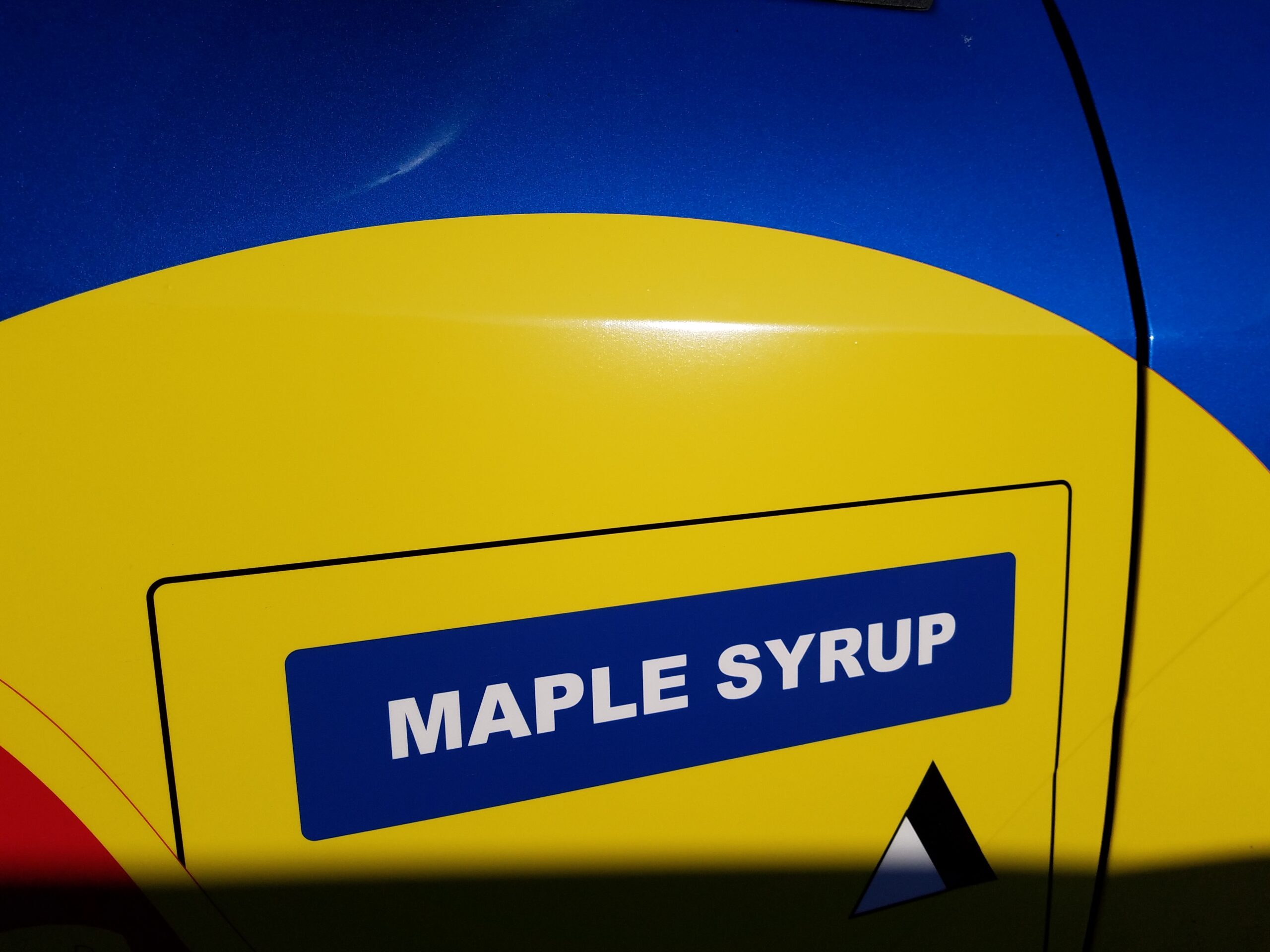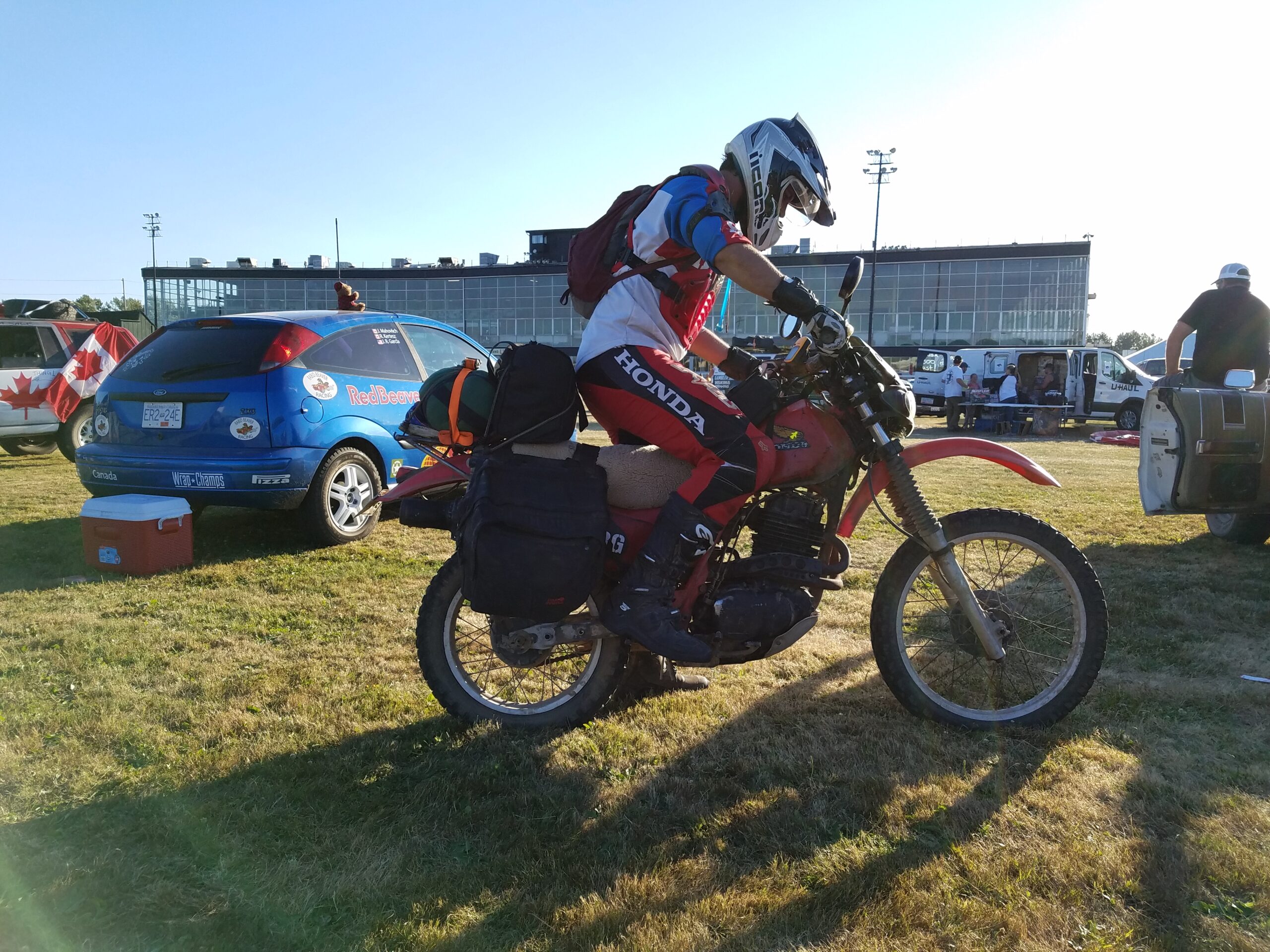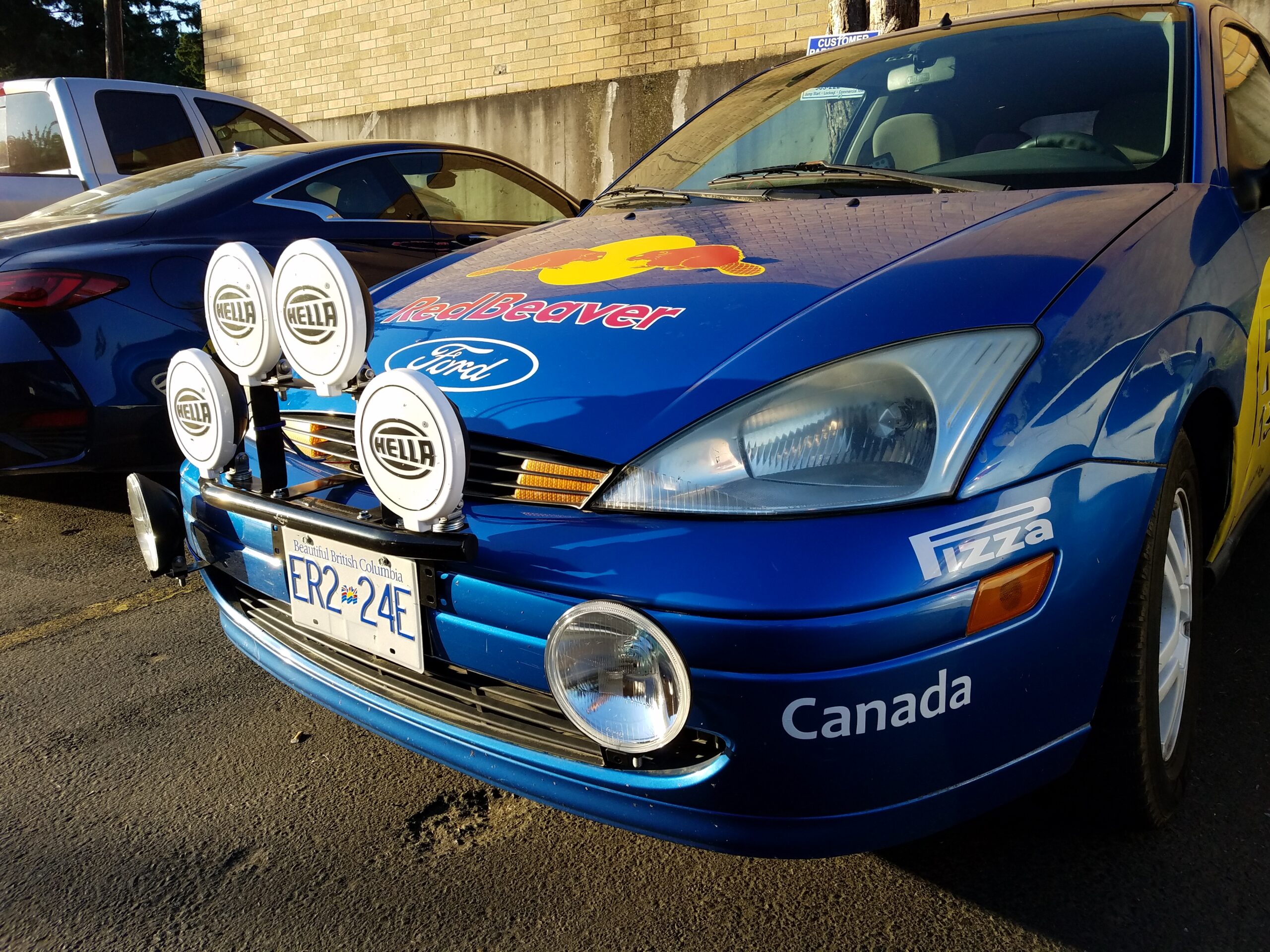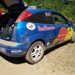 The Red Beaver is a 2002 Ford Focus ZX3 hatchback with a 5-speed manual and that Jeremy picked up for $600 bucks. After a mild tune up of new spark plugs, fluids, and an air filter the car was given spacers to add ground clearance. The wheels were painted white and an Amazon Prime ordered light bar was dressed on the grille. Jeremy and Ron created a spoof livery on the Red Bull rally car of the same era. (Points for creativity!) I had no idea how the car was going to look until I saw at 11 pm the night before the race. Seeing my name on a professional looking rally car was a really good feeling.